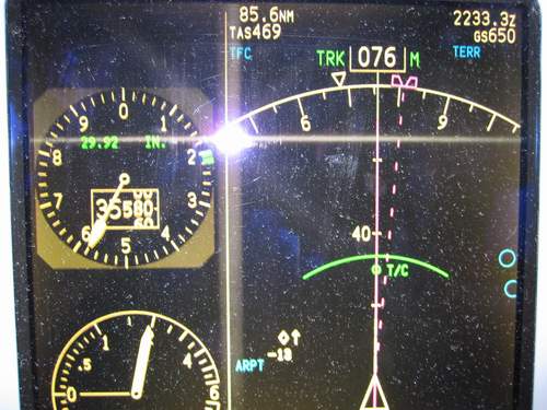 East of Dallas, Climbing at 2000 Feet Per Minute through Flight Level 35,580.