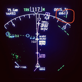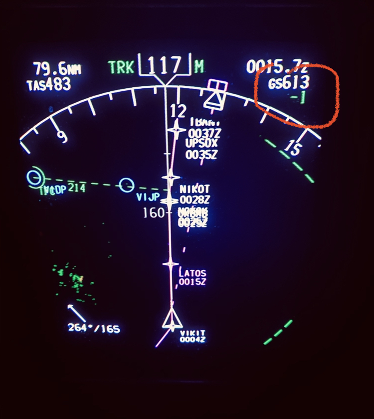 Notes:Enroute from Ho Chi Minh City, Vietnam (SGN) to Niigata, Japan (KIJ). As we neared Japan, our groundspeed kept increasing. We were holding just less than 700kts. We decided to momentarily turned off the airway to get the full effect of the wind. I shot the photo as we hit 707kts. Weather was clear and smooth.