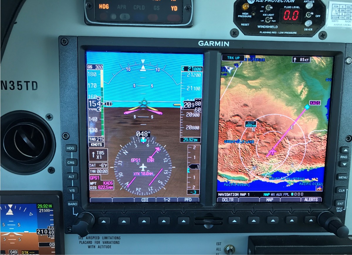 • Notes: I was in cruise, with a 100-knot tailwind, showing 291 ground speed, running lean of peak. I had to go for the 300, so I pushed everything forward for a couple of minutes and saw 305 on the Garmin KLN94 and on the Garmin GPSMAP 396. Flight Aware shows 298 as top. The ride was smooth, and we were above the clouds. This was exactly the time when Buffalo, NY, was getting pounded with an early snowfall. The plane has a Tornado Alley Turbo turbonormalizer system, and we were loaded heavy that day. Nice plane! This was the beginning of a 4200-mile journey which took us from Louisiana to Vermont, then NY, then Arizona, and back to Louisiana.